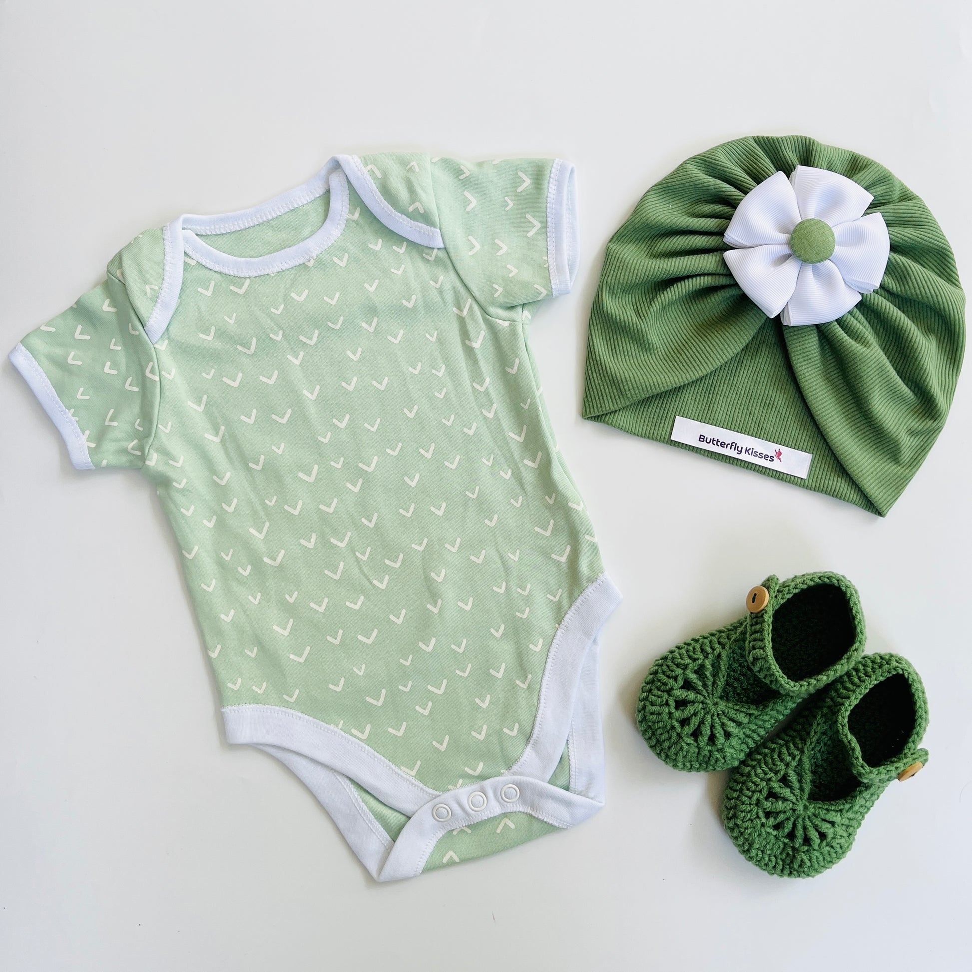 Embrace the charmingly natural look with our luxurious Sage Green Baby Outfit Set, perfectly sized for little ones from 3-6 Months. This adorable, three-piece baby clothing set is crafted for comfort and photo-readiness, featuring a soft, patterned bodysuit with easy-access snaps, a fashionable ribbed baby turban, and a pair of delicate, hand-finished crocheted booties to complete the look. Ideal as a thoughtful baby shower gift, a cozy newborn outfit (for the 3-6 month stage), or a lovely addition to your little one's stylish baby girl clothes collection. Shop this high-quality, unisex infant outfit today and bring a touch of earthy elegance to your baby's wardrobe—it's the perfect blend of trendy design and supreme softness for sensitive skin.