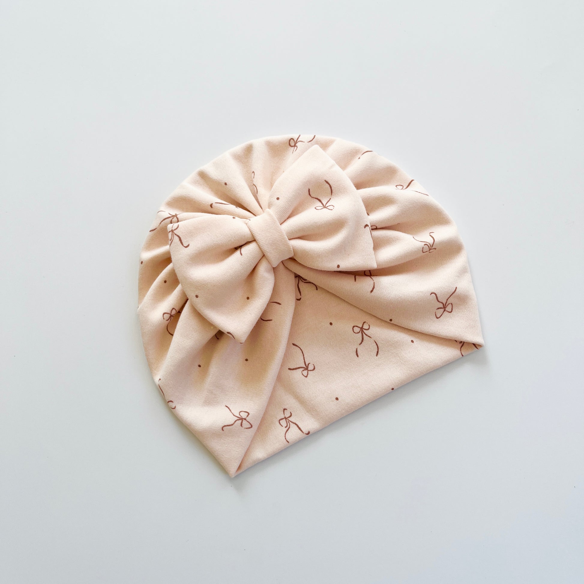 Bows Printed Light Peach Colour Baby Turban Hats in Bow, Flower & Donut Designs