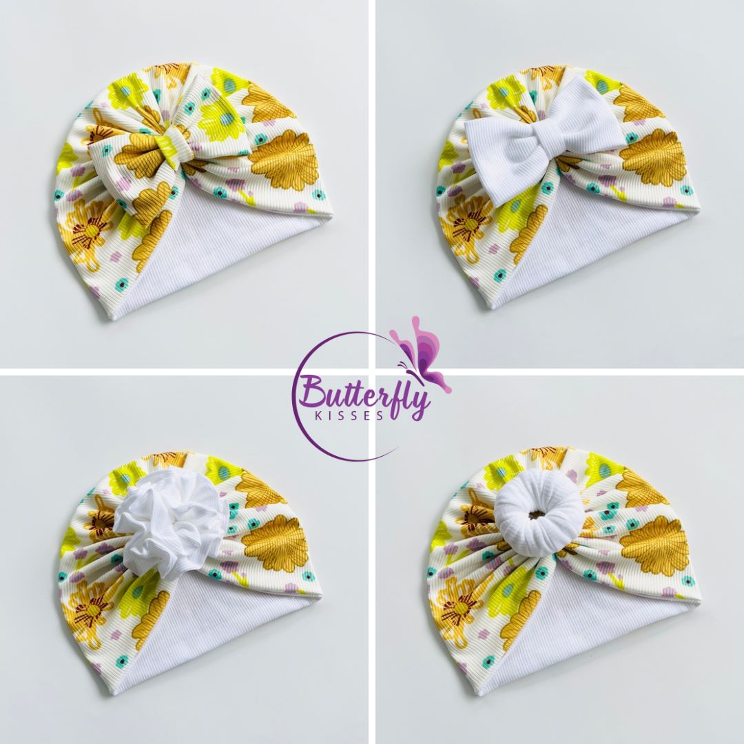 White, Yellow & Brown Floral Printed Baby Turban Hats in Bow, Flower & Donut Designs