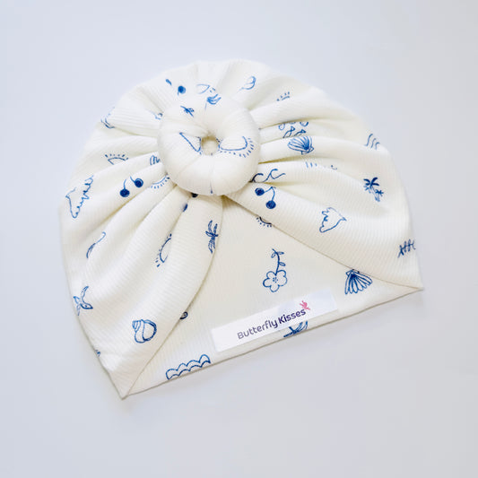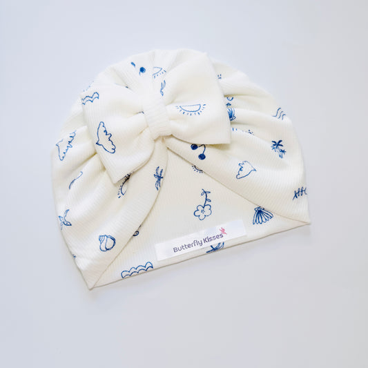 Baby Girl Ocean Doodle Bow Turban Hat – Soft Ribbed Cotton Beanie Cap
